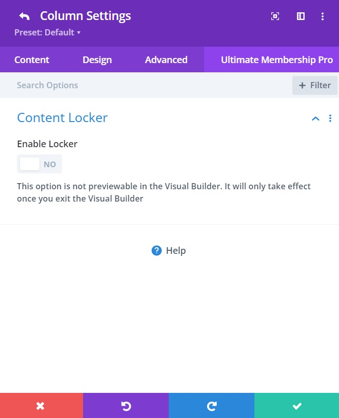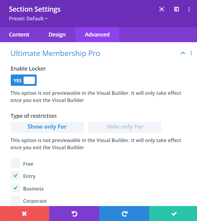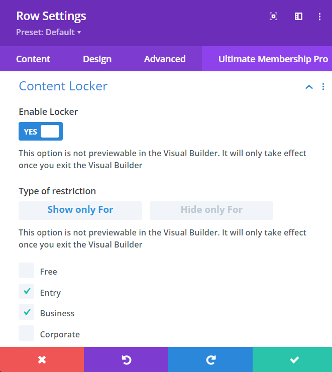 All the restrictions are made according to the memberships existing in Ultimate Membership Pro main plugin. When a new post is created, a Content Locker will be available in every column, row or section settings.