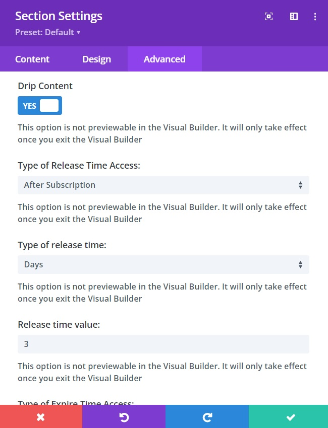 Another option available in Divi Content Locker is to release content from Sections, Rows and Columns through the Drip Content system.